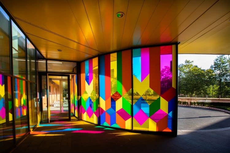 Artfelt, The Children’s Hospital Charity’s arts programme, worked with leading artist and place maker Morag Myerscough to create a riot of colour for the Main Entrance of Sheffield Children’s Hospital. They commissioned Morag to enhance the status of the entrance and provide a welcoming, playful experience for patients visiting their Western Bank site. It looks glorious in the sun!